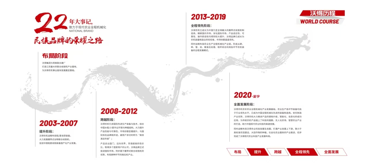 沃得農機隸屬于中國民營企業500強之一的江蘇沃得集團,占地面積3000余畝,員工8000余人,2016年實現銷售70億元人民幣,是一家集研發、生產、銷售、服務于一體的大型現代化農機裝備制造企業。沃得農機立足水田,致力于現代農業全程機械化,歷經近30年發展,產品形成以耕-種-田間管理-收獲-秸稈綜合利用-糧食后處理全系列產品線。依托優質的產品和誠信的服務,公司產品暢銷全國28個省市自治區,出口至世界38個國家和地區。